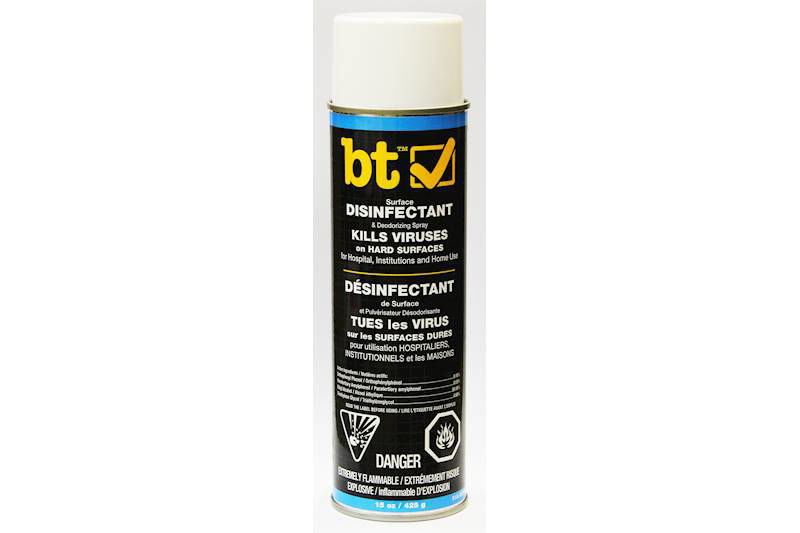 An effective surface disinfectant and deodorizing spray formulated with a non-selective bactericide for fast disinfection and odour elimination on hard surfaces For industrial, hospital, home, and restaurant use Powerful germ killing action Broad spectrum bactericide Regulated by HPB Canada, DIN #02335565 Kills gram positive and negative organisms including: Staphylococcus aureus, Salmonella choleraesuis, Pseudomonas aeruginosa, Escherichia coli, Trichophyton interdigitale, Mycobacterium tuberculosis and Influenza A2 Virus Active Ingredients: Orthophenyl Phenol (0.10%), Paratertiary Amylphenol (0.03%), Ethyl Alcohol (50.16%), Triethylene Glycol (4.66%) For effective killing action, allow surface to remain wet for 10 minutes