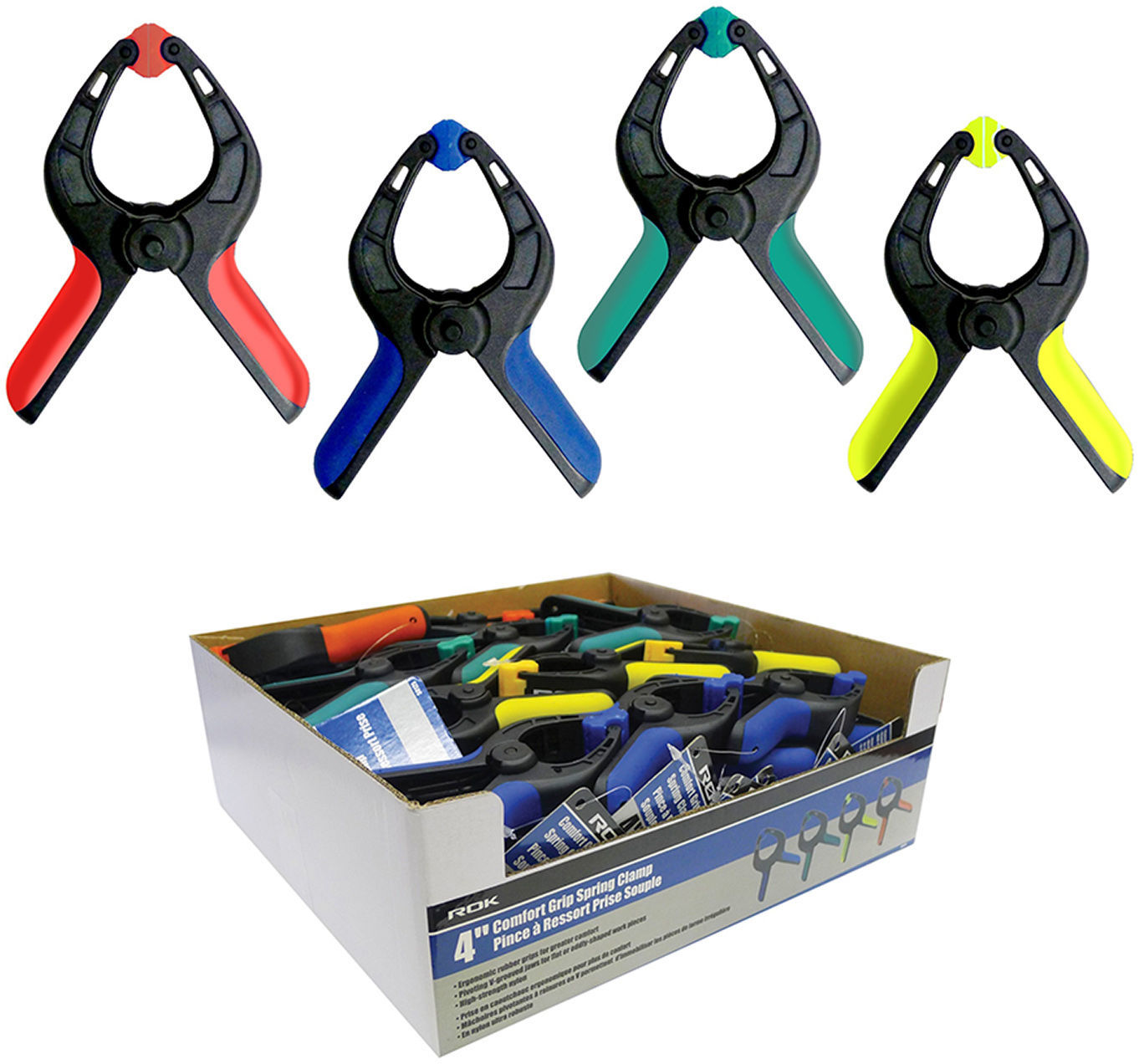 • Sold in 48-piece display box • Assorted colors • Ergonomic rubber grips for greater comfort • Pivoting v-grooved jaws for flat or oddly-shaped work pieces • High-strength nylon