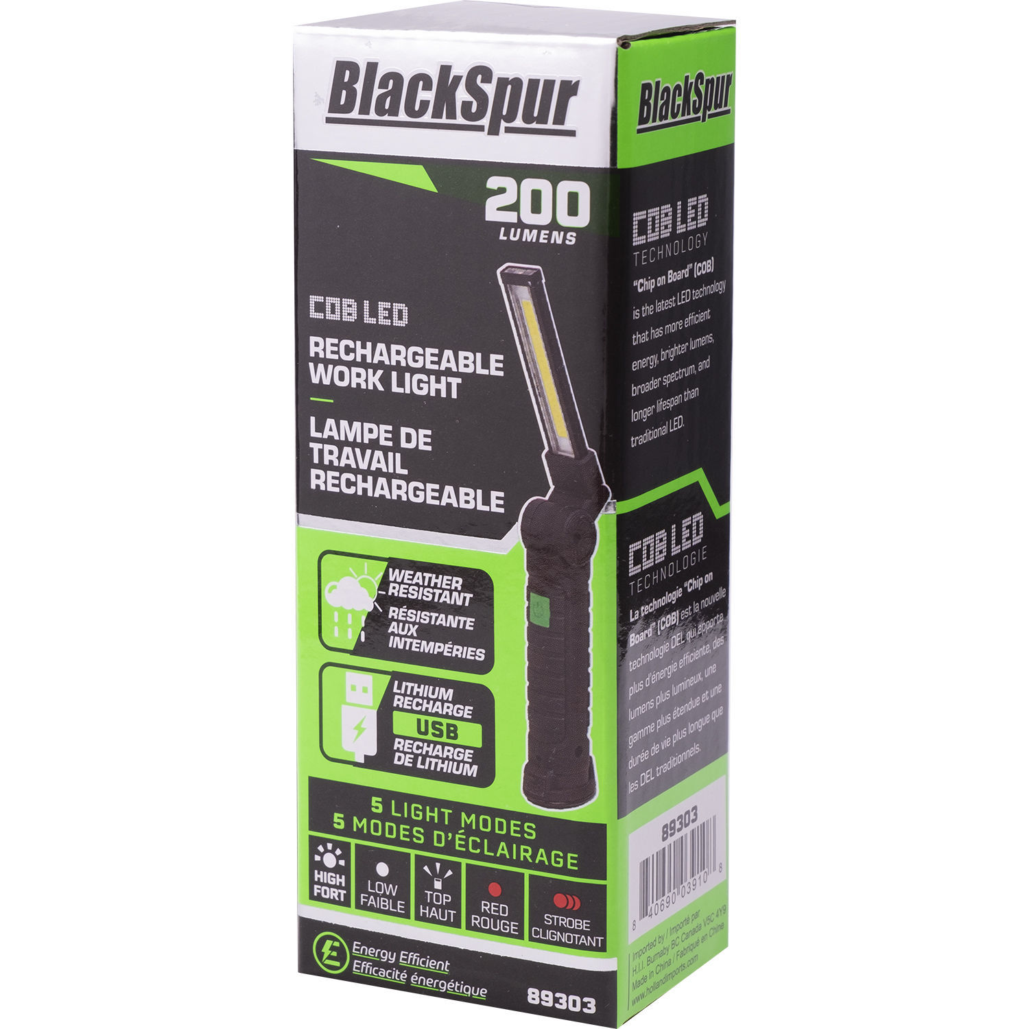 - 5 Light Modes: High - Low - Top light - Red light - Red strobe - IPX4 rating weather resistant and water proof - USB rechargeable for longer lasting power. Charging cable included - Multifunction light sources in work light, flashlight, and emergency lights (long press to activate) - A hook and magnetic base for easy mounting anywhere