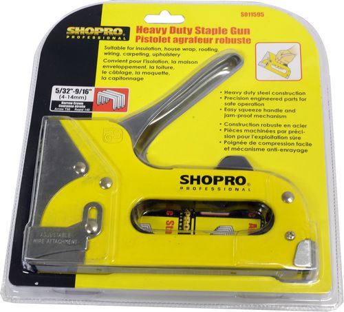 • Heavy duty steel construction • Easy squeeze handle and jam-proof mechanism • Suitable for insulation, house wrap, roofing, wiring, carpeting, upholstery • Accepts 5/32in - 9/16in narrow crown staples • Uses arrow T50 or rapid 140 staples • Comes with 400 - 5/16in staples • All Shopro staples fit in this model