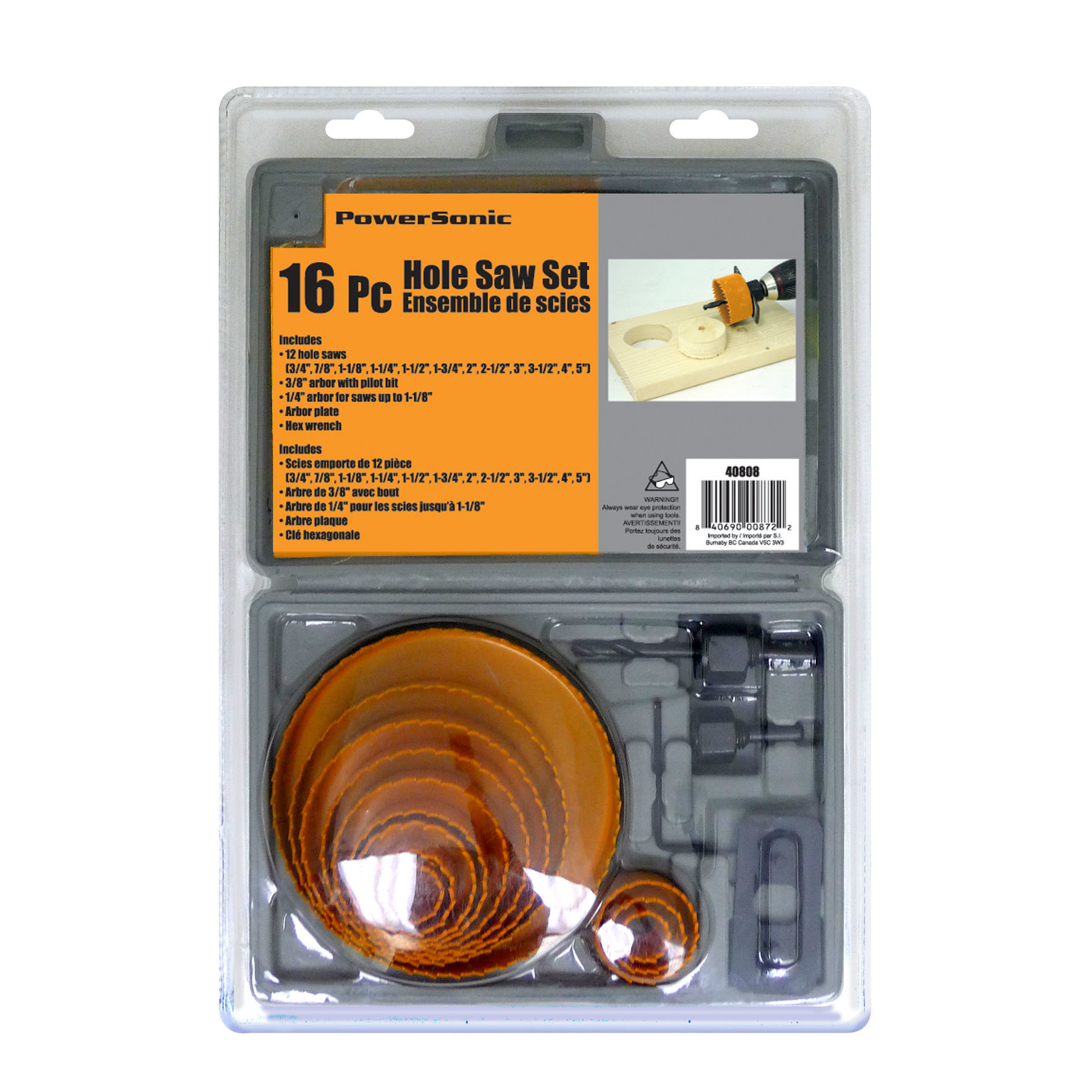• Set includes 12 hole saws (3/4in, 7/8in, 1-1/8in, 1-1/4in, 1-1/2in, 1-3/4in, 2in, 2-1/2in, 3in, 3-1/2in, 4in, 5in) • 3/8in Arbor with pilot bit • 1/4in Arbor for saws up to 1-1/8in • Arbor plate • Hex wrench